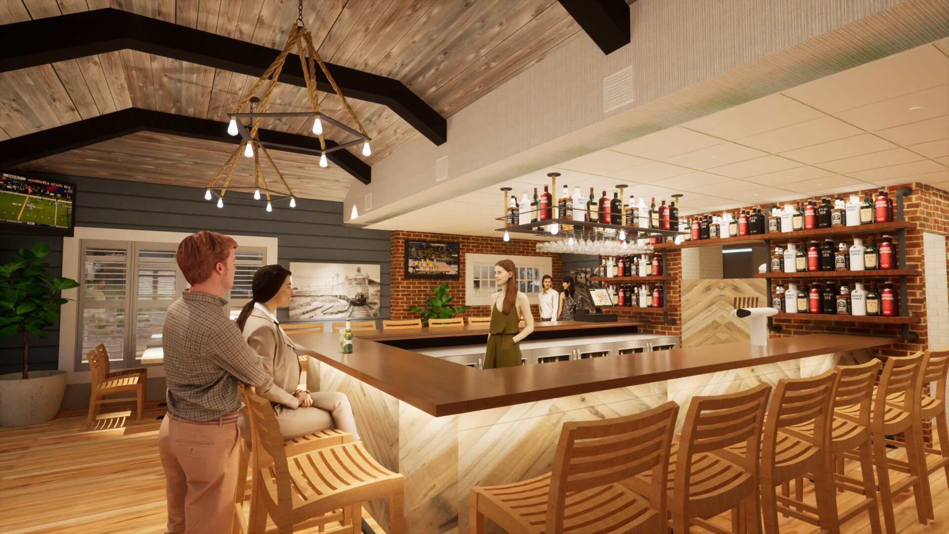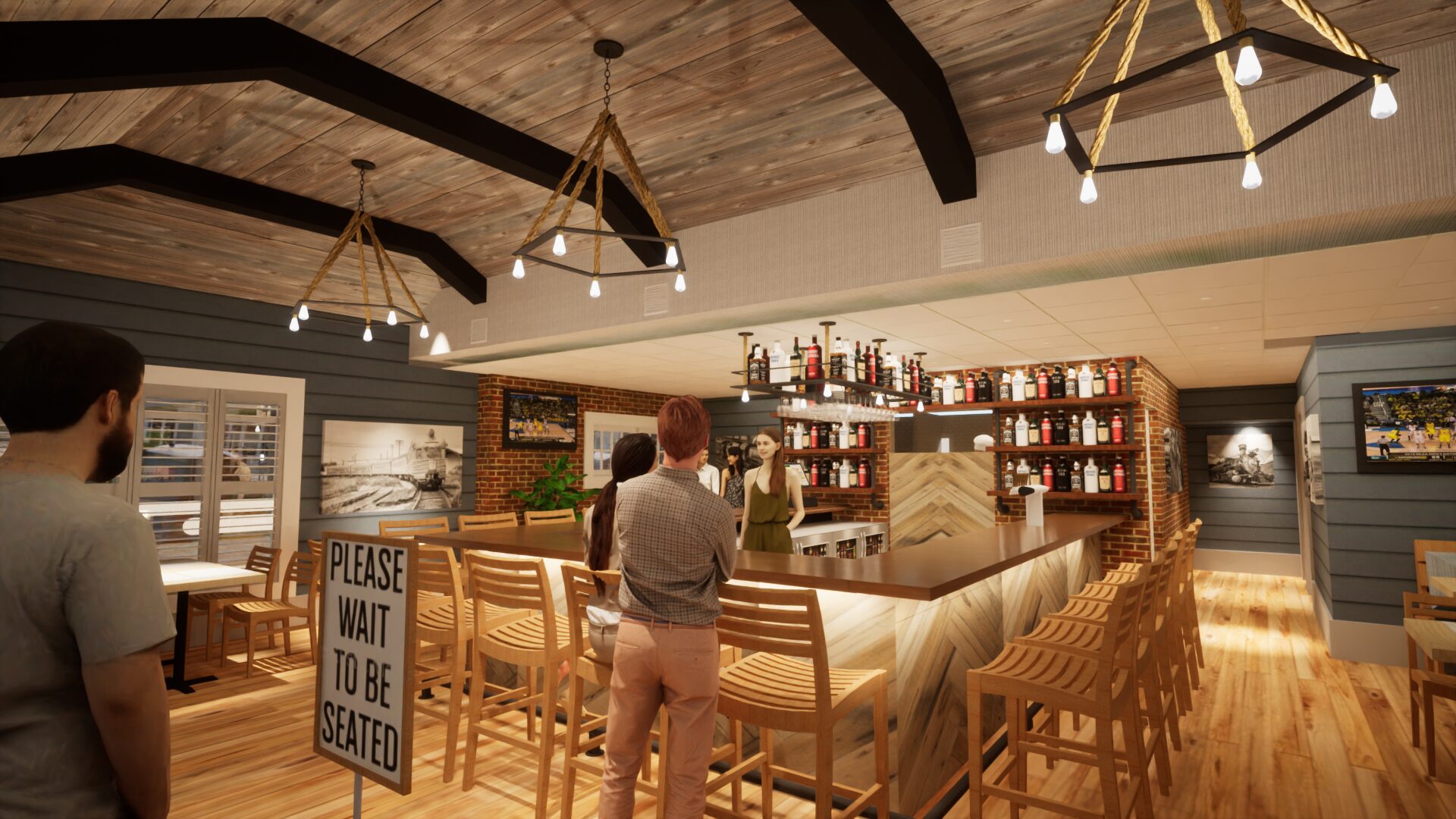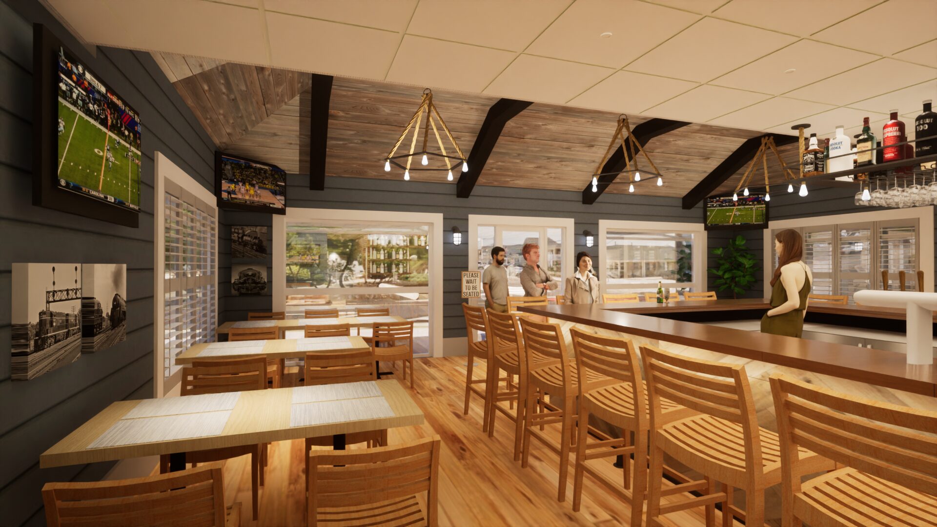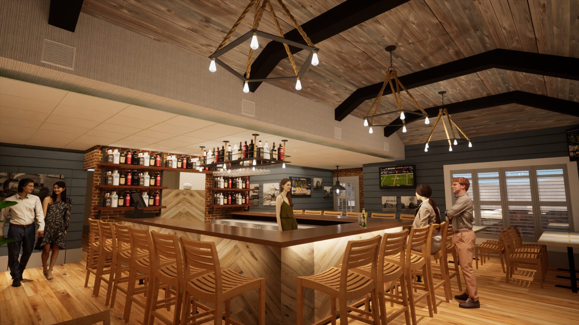 Maybe one of the smallest restaurant bars we ever worked on. The challenge was to make it feel comfy, not cramped. The center bar, vaulted ceiling, and many nooks give your eye plenty of places to focus on, instilling a sense of comfort.